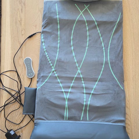 Beurer massasjesete i svart farge med integrert fjernkontroll. Setet legges i stol eller på annen sitteplass og kobles til strøm. Fjernkontrollen har flere innstillinger for ulike områder av ryggen og setet, samt justering av intensitet. Passer til bruk hjemme eller på kontor for enkel massasje mens man sitter.