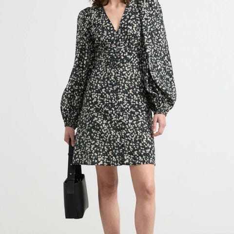 Lindex hverdagskjole for dame i størrelse S. Kjolen er flerfarget med brede kontraststriper i lyse og mørke toner. Den er laget i akryl og har et rett, løstsittende snitt med lange ermer.