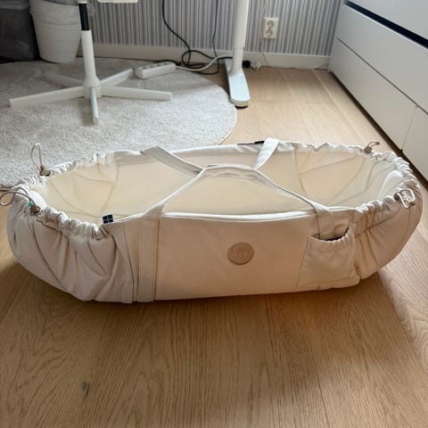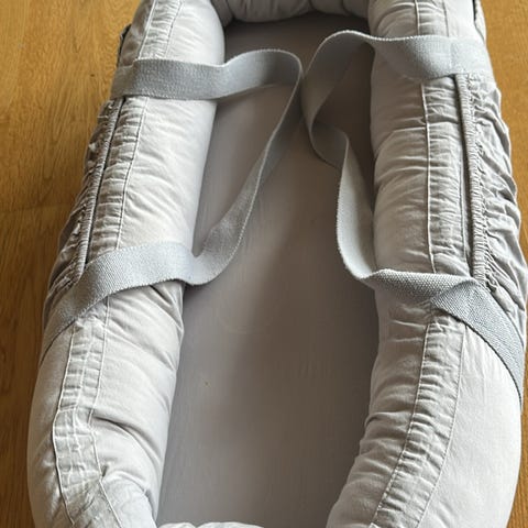 Najell Babynest i mykt tekstil i fargene grå og krem. Nestet har polstrede kanter rundt hele liggeflaten og håndtak på sidene for enkel flytting. Snøring rundt kanten gjør det mulig å tilpasse åpningen. Egnet som liggeplass for baby på sofa, i seng eller på gulv under tilsyn.