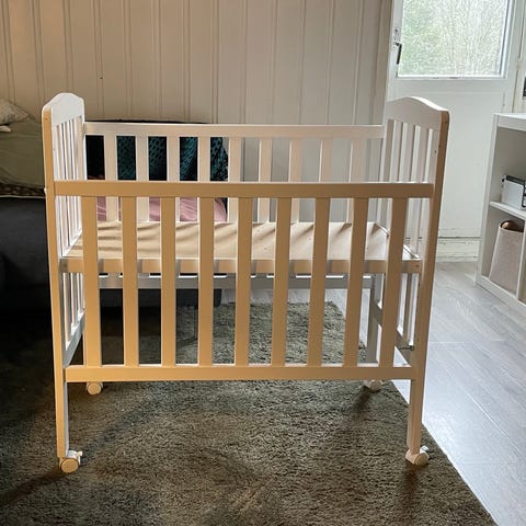 Selger en vugge med en ny ubrukt madrass. Madrassen er kjøpt ny på Jollyroom i vinter til 379 kr. Vuggen har flere små bruksmerker.