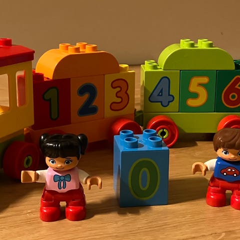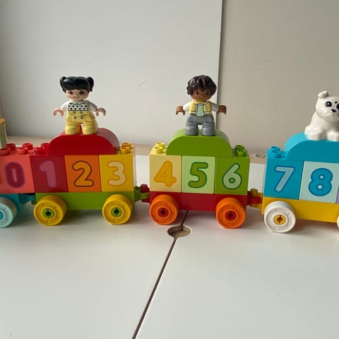 LEGO DUPLO togtog med tallklosser i flere farger. Settet består av lokomotiv og vogner med tallene 0–9 på klossene, to DUPLO-figurer og en liten hundefigur. Toget kan trilles på hjul, og klossene kan bygges om og kombineres på ulike måter. Passer for små barn som liker byggesett og lek med tall og farger.