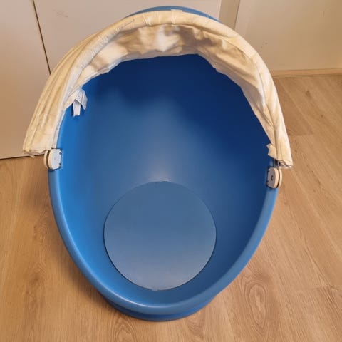 IKEA barnestol i blå plast. Stolen har rund form med sokkel og integrert sete. Overdelen har en avtakbar hvit tekstilskjerm som kan trekkes over åpningen. Egnet som sittemøbel for barn innendørs. Materiale hovedsakelig plast med tekstil i skjermen. Kan snurres rundt. Pris kan diskuteres