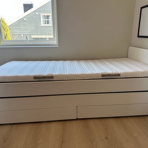 Sengen er i god stand, selv om den har blitt brukt en stund. Madrassen er ikke brukt like lenge som sengen og er i veldig god stand, dette på grunn av også bruk av overmadrass. Overmadrassen følger ikke med.