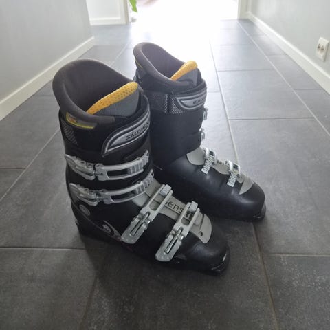 Salomon skistøvler i størrelse 33,5 (EU), tilsvarende UK 16 og US 16,5 for herre. Modellen har hard ytterskall i plast med fire justerbare spenner i metall og kraftig powerstrap over ankelen for bedre støtte. Farge hovedsakelig svart med gule detaljer og polstret innerstøvel. Passer til alpinski med standard alpint binding-system.