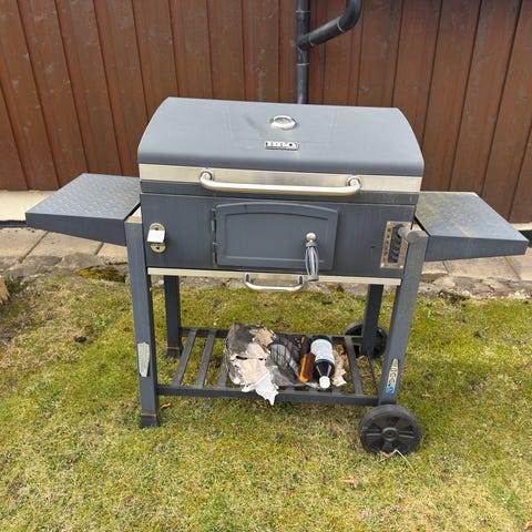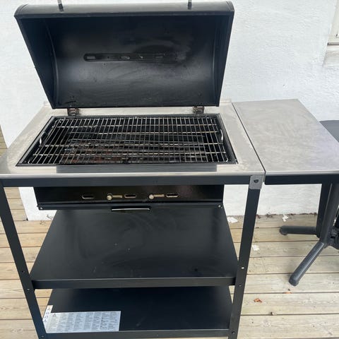 Grill på stativ med hjul i metall. Rektangulær grillflate med todelt grillrist i metall. Grillen har underhylle i metall for oppbevaring av utstyr og to hjul for enkel flytting. Egnet for grilling utendørs på terrasse, hage eller lignende områder. Drivstofftype og nøyaktige mål er ikke oppgitt.