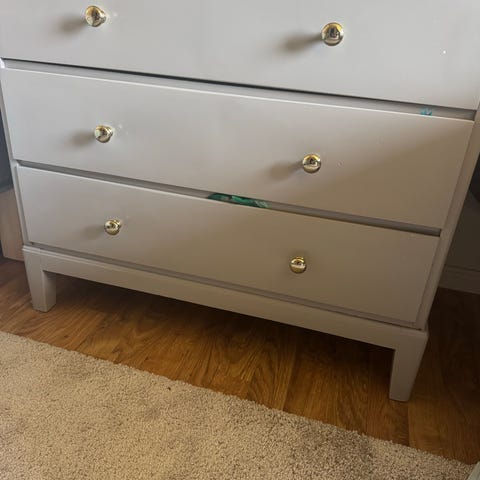 Kommoden er brukt og har noen synlige bruksmerker, men den er fortsatt i god stand og fungerer som den skal.
