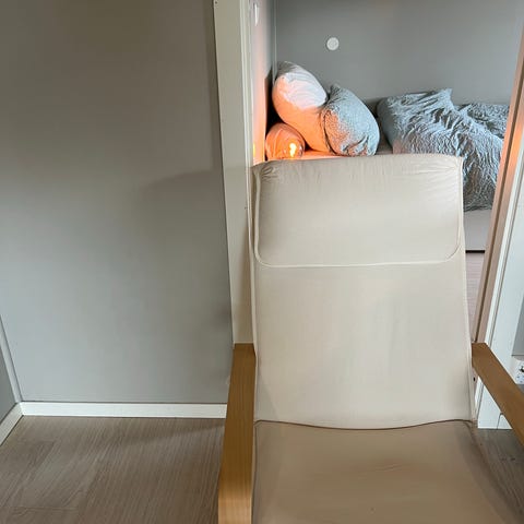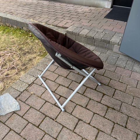 Gir vekk en poeng lenestol og skammel. Stolen kan brukes, men det kan se ut som det mangler en pute i nakken.