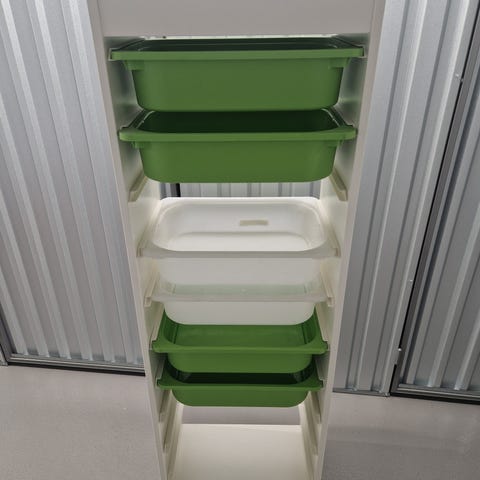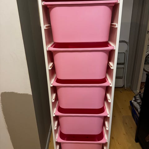 IKEA oppbevaringshylle med plastkasser. Hyllen består av en høy, smal ramme med flere uttakbare plastkasser i grålig/hvit farge. Egnet til oppbevaring av leker, klær eller annet utstyr på barnerom, gang eller andre rom der det er behov for oversiktlig oppbevaring. Kassenes utforming gjør det enkelt å ta dem ut og sette dem inn igjen i rammen.