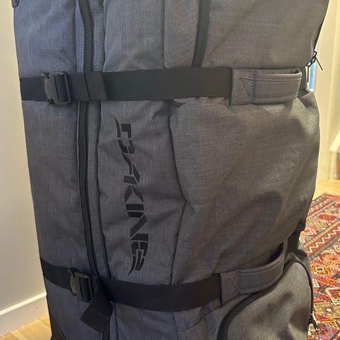 Dynastar trillebag i brun tekstil med lyse stropper. Vesken har teleskophåndtak og hjul for enkel transport. Flere bærehåndtak på sidene og toppen. Utvendige stropper for komprimering av bagasjen og D-ringer for eventuell ekstra festing. Glidelåslukking og forsterket bunn med hjul og støtteklosser. Egnet som reisebag eller sportsbag til utstyr og klær.