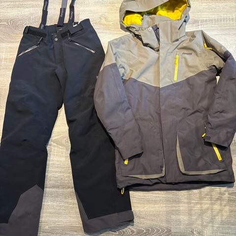 Klassisk, originalt Bergans gul skalljakke og svart vattert vinterbukse, kjøpt nytt i 2025 og brukt til alpin- kjøring noen få ganger av ett barn (ikke brukt til daglig/ på skolen). Ingen skader/ merker/ hull.
