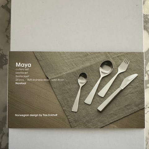 Bestikket Maya er en norsk designklassiker designet av Tias Eckhoff i 1962 og var i produksjon hos Norsk Stålpress frem til 2000-tallet når danske Stelton tok over. Bestikket har en fantastisk stilsikker form og er svært godt å holde i hånden.