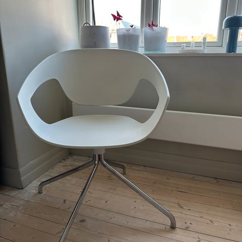 Pent brukt nyreformet skrivebord. Hvit plate spesiallaget av møbelsnekker. Beina er av krom. Det er største bredde og dybde på skrivebordet som er oppgitt. Siden den tykkeste delen er forskjellig på de to sidene, vil borde trenge 75 cm i dybden. Må hentes.