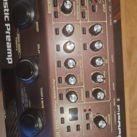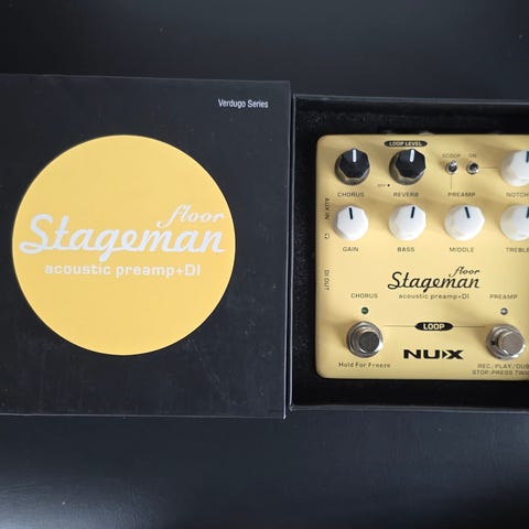 LR Baggs Venue DI akustisk gitar preamp og DI-boks i brun utførelse. Enheten kombinerer aktiv preamp med DI-boks og har flere kontroller for toneforming, inkludert volum, gain, EQ-seksjon og notch-filter. Frontpanelet har fotbrytere for blant annet mute og boost. På siden finnes tilkoblinger som instrumentinngang, send/return for effektsløyfe, boost-kontrollinngang, XLR DI-utgang og jordløft (ground lift).