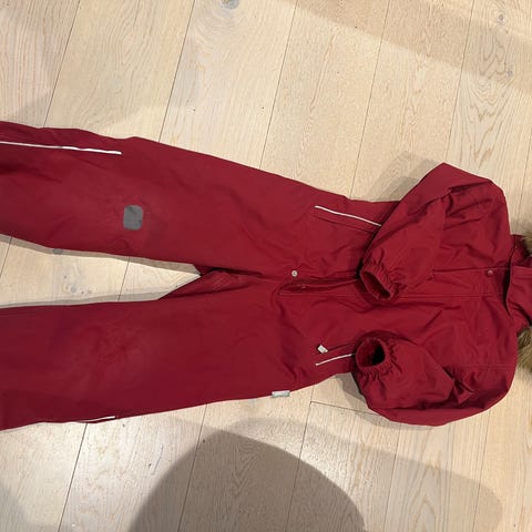 Reima vinterdress i vinrød-farge str 122. Noe slitt på rompe og knær. På det ene kneet er det ett lite hull og et påbegynnende hull. Dette kan enkelt sys eller settes en lapp over. Fortsatt mye dress igjen.