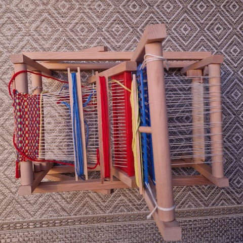 Brio vevstol i tre som leketøy. Vevstolen er laget i lyst treverk med enkelte plastdeler, og leveres i original eske med bruksanvisning. Passer til barn fra ca. 5 år og oppover. Kan brukes til enkel veving av små tekstiler, for eksempel skjerf eller duker, og gir mulighet til å øve inn grunnleggende veveteknikk. Settet inneholder vevstol og tilbehør som trengs for å komme i gang med veving. Mangler bruksanvisning. Kan sendes.