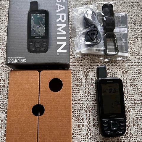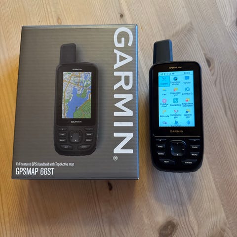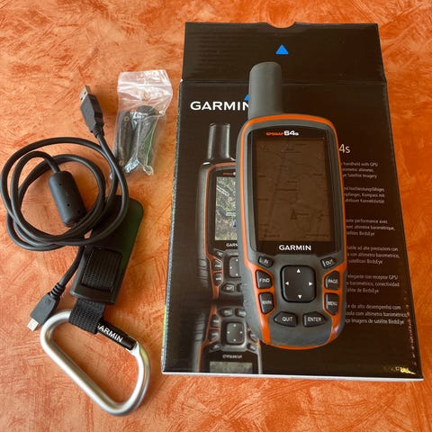 Garmin GPSMAP 64s håndholdt GPS-enhet. Modellen har fysisk tastatur, innebygd antenne på toppen og skjerm i front. Enheten leveres med belteklips på baksiden og karabinkrok festet i stropp for enkel montering på sekk eller belte. Egnet til bruk på tur, friluftsliv og navigasjon til fots eller i andre situasjoner der man ønsker en robust, håndholdt GPS.