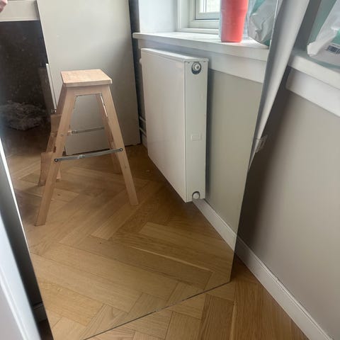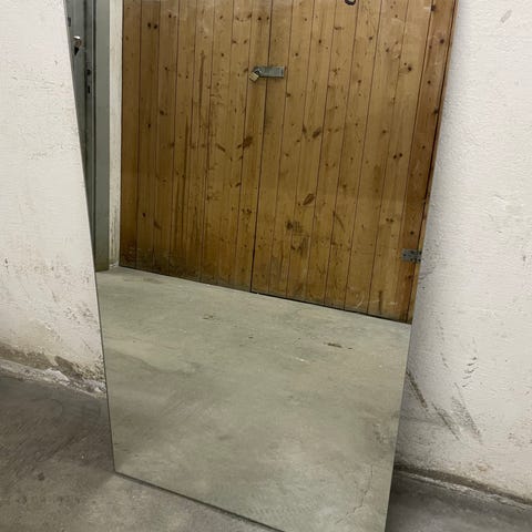 Speil i rektangulær form. Speilet har rette kanter og kan brukes som helfigurspeil eller veggspeil i for eksempel gang, soverom eller garderobe. Egnet til innendørs bruk i hjemmemiljø. Nærbilder viser kantene på speilet for å gi inntrykk av tykkelse og utførelse. Har et ødelagt hjørne.
