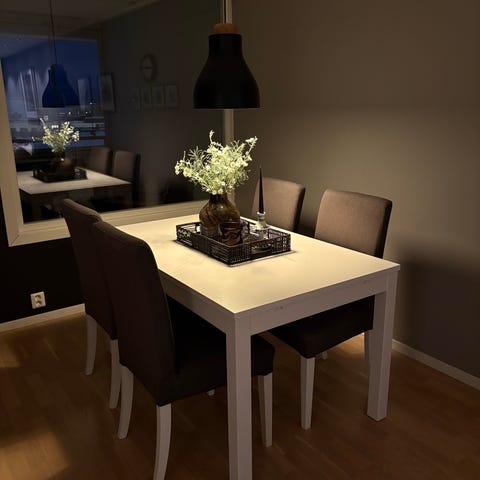 Spisebord i heltre.Bordets overflate er blitt malt i ettertid.Kan med fordel males på nytt med farge etter eget ønske.