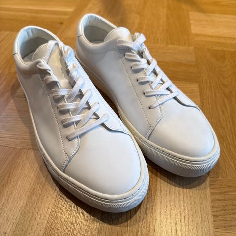 Acne Studios sneakers joggesko i størrelse 43. Modellen er lave joggesko med snøring. Skoene er hvite og har innersåle med Acne Studios-logo. Yttermateriale fremstår som glatt og blankt, og sålen er i gummi. Passer til hverdagsbruk og fritid.