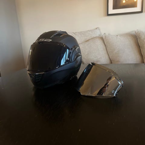 Speed and Strength Go For Broke MC-hjelm i helhjelm-design. Hjelmen er i matt svart farge med grafikk på sidene og bak. Fronten har speilvisir i blålig tone. DOT-merking bak indikerer at hjelmen er godkjent etter DOT-standard. Ytterskallet er i hardt plastmateriale med integrerte lufteluker. Egnet som motorsykkelhjelm til vei- og gatebruk. Størrelse medium.
