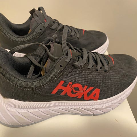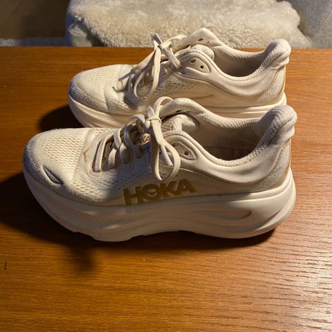 Hoka Bondi 9 løpesko for dame i størrelse 37. Modellen er en nøytral løpesko med tykk mellomsåle for god demping. Overdelen er i pustende mesh i lys grå farge med snøring for justerbar passform. Skoene er egnet til løping og annen trening på hardt underlag.