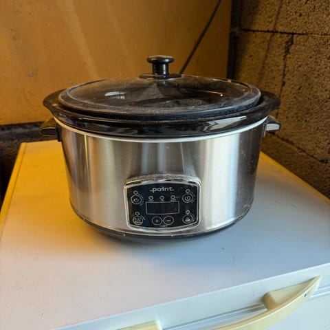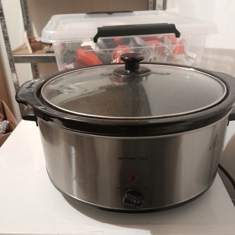 Menuett slowcooker med glasslokk og ytre i rustfritt stål. Enheten har digitalt betjeningspanel med funksjoner for lav, høy og varmholdingsmodus, samt egne knapper for valg av program og tid. Gryten egner seg til langtidskoking av gryteretter, supper og lignende retter. Lokket er i gjennomsiktig glass med håndtak i plast, og apparatet har bærehåndtak på sidene for enkel flytting.