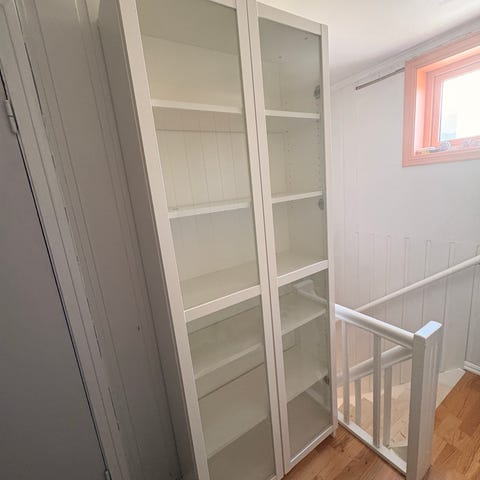 Fin stand. Samme som denne: https://www.ikea.com/no/no/p/billy-oxberg-bokhylle-hvit-s69017828/