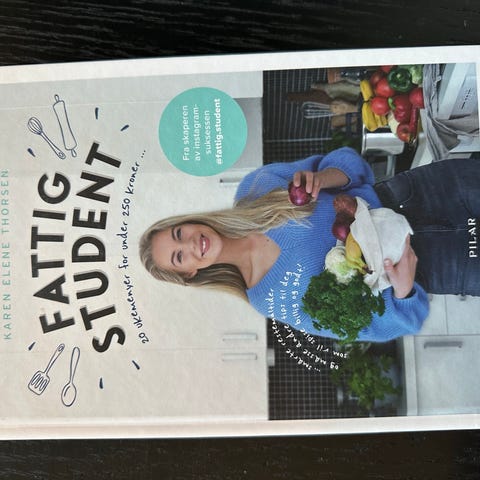 Fattig student kokebok med oppskrifter på rimelige middager. Boken inneholder 20 ukemenyer med retter til under 250 kroner per uke, tilpasset studenter og andre som ønsker en budsjettvennlig matplan. Oppskriftene er enkle og basert på vanlige råvarer, og boken egner seg godt til hverdagsmatlaging og planlegging av ukesmenyer.