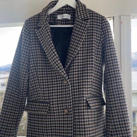 Fint og lite brukt Brooklyn Camilla Pihl blazer for dame i størrelse M. Blazeren er laget i ull og polyester har et grønn rutete mønster. Klassisk fasong med slag, Knappelukking foran og lommer. Passer til bruk både til hverdags og mer formelle anledninger, og kan kombineres med ulike overdeler og bukser.
