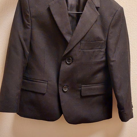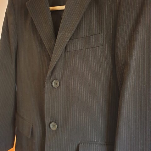 Brukt 1 gang i bryllup . Ser mer grå ut på bildene, men er sort med grå striper. Barnet på bilde er akkurat 2 år og normal str. på barnet . Da var dressen akkurat litt stor. Ny pris ca 800,-