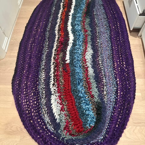 Håndlaget heklet teppe i tradisjonelt bestemorrutemønster. Teppe består av mange små ruter i ulike farger, satt sammen med mørk blå som hovedfarge rundt rutene. Garnet ser ut til å være i blandede, klare farger som rød, grønn, gul, hvit, blå og flere nyanser imellom.