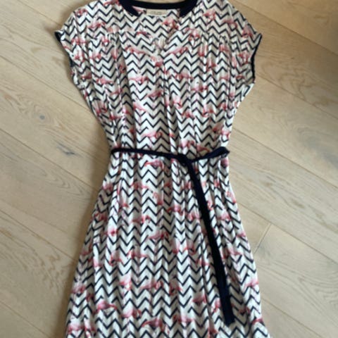 Holly & Whyte kjole til hverdag eller fest for dame i størrelse 36. Kjolen er laget i polyester og har et flerfarget geometrisk mønster i hovedsakelig mørke og lyse toner. Modellen har kort erm, rund hals og glidelås i ryggen. Midjen er markert med knyting/detalj foran.