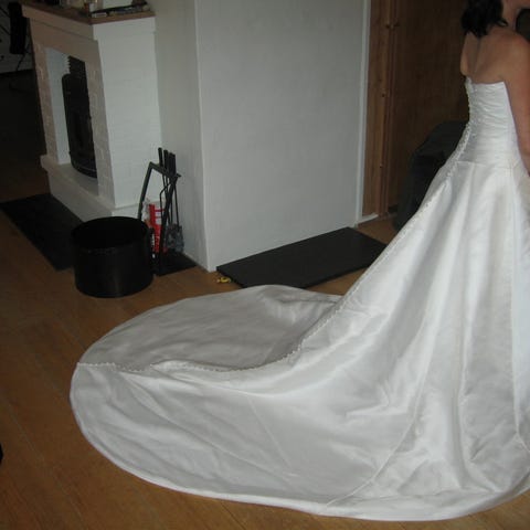 Renseriet klarte dessverre ikke å få nederste del av slepet helt hvitt igjen – noe som ikke er uvanlig for brukte brudekjoler – men det burde ikke være veldig synlig. Ellers ser den like nydelig ut som dagen jeg gikk i den selv.