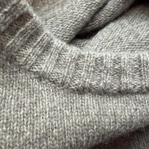 Strikket i Sisu garn, 20% nylon og 80% ull. Myk og god, stikker ikke.