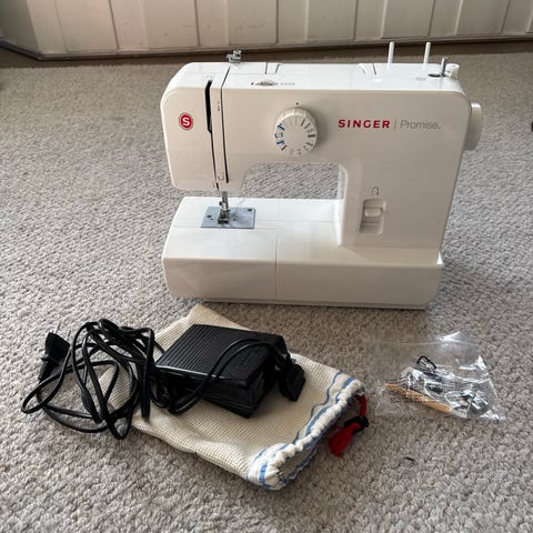 På bildene følger det med tilbehør i plastpose fra Singer, blant annet ekstra trykkføtter og smådeler til bruk ved søm og vedlikehold.