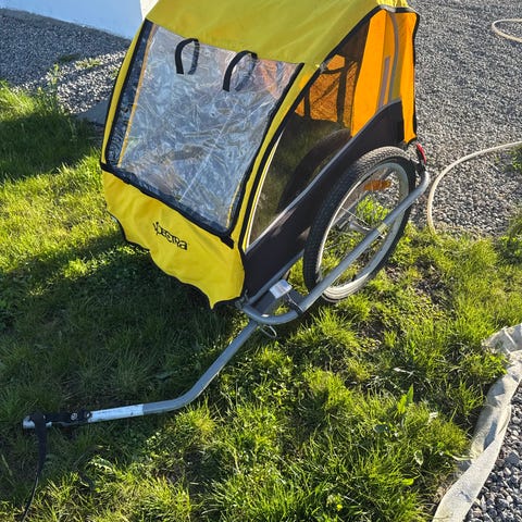 Arett sykkelvogn i rød og svart farge. Vognen har to hjul med reflektorer bak og et solid drag for montering på sykkel. Kabinen har store nettingvinduer på sidene og foran for god lufting, samt et transparent overtrekk foran som kan lukkes. Bak er det åpning med klaff. Egnet til transport av barn eller last etter sykkel, avhengig av godkjenning og brukerveiledning fra produsent. Ramme i metall og trekk i tekstilmateriale.