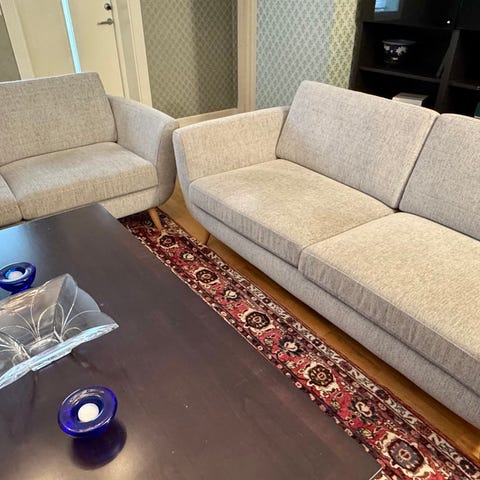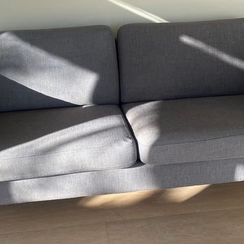 2,5 seter sofa fra merket Furninova sun i silver (gråtone) med ubehandlet treben. Benyttet som avlastningssofa, men er svært lite brukt og fremstår som ny/ingen anmerkninger. Sittedybde 58 cm, og sittehøyde 44 cm. Kjøpt ny på Skeidar for noen år tilbake, nypris 18 399. Hentes på Ranheim/Trondheim. Dyre- og røykefritt hjem.