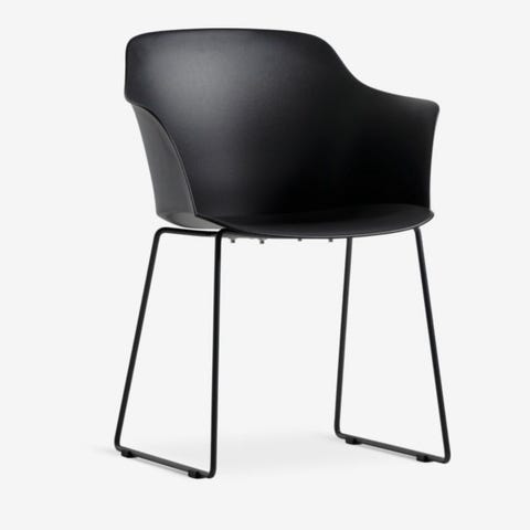 Spisestol med formstøpt sete og rygg i svart plast og ben i lyst tre. Stolen har buet rygg og armlener som gir omsluttende sittekomfort. Egner seg til bruk ved spisebord ute på terrassen.