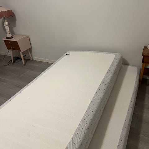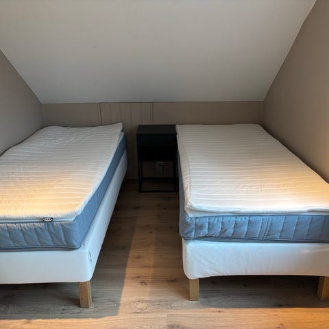 2 stk. Wonderland rammesenger 90/200 med overmadrass og sengegavl. Sengene har mørkeblå tekstiltrukket ramme og treben/bøyler i bjørk. Overmadrassene av merket Wonderland. Sengene er brukt på gjesterom. Prisen gjelder for begge sengene og gavlene