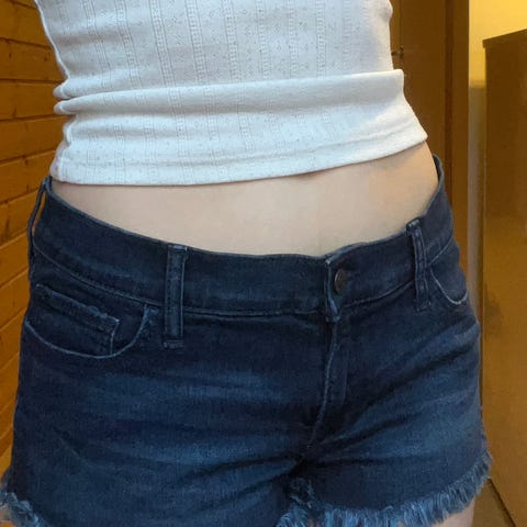 Abercrombie & Fitch High Rise Mom Shorts denimshorts for dame i blå denim. Shortsene er i størrelse 36 og har høyt liv. Klassisk femlommersmodell med glidelås og knapp i front. Råkant og slitte detaljer gir et brukt preg. Laget i denimstoff som gir et fast og holdbart plagg egnet til hverdagsbruk i varme perioder.