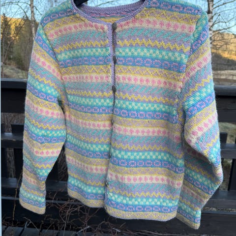 Nydelig hjemmestrikket kufte / kofte i flotte farger og 100% ull, og med tinn-knapper. Kun brukt/prøvd et par ganger. Selges da den bare henger i skapet, og i håp om at andre kan ha glede av den🥰 Sender gjerne📦