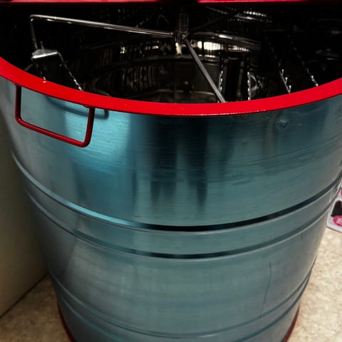 Rustfri honningbeholder 50L m. lokk, sil, tappekran og stativ - 1 stk: kr 1000,-