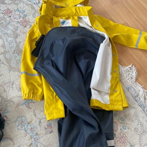 Lite brukt regndress str. 14 år. Merke pytt pytt. Regnjakke med hette og lommer. Bukse med stramming nede.