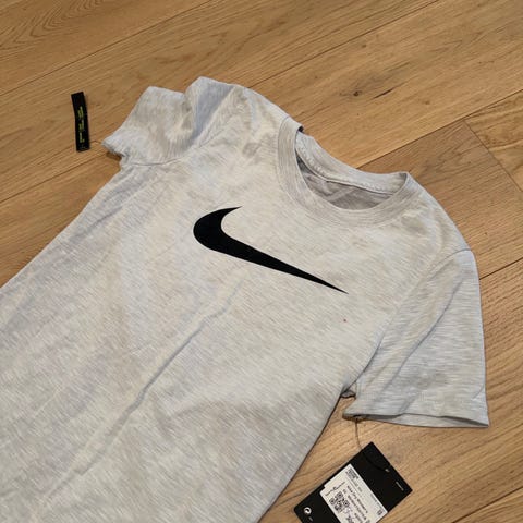 Nike Dri-Fit T-skjorte i blått for dame i størrelse S. T-skjorten er laget i polyester med fukttransporterende Dri-Fit-materiale. Kortermet modell med rund hals og stor Nike-logo foran. Egnet til trening og annen fysisk aktivitet.