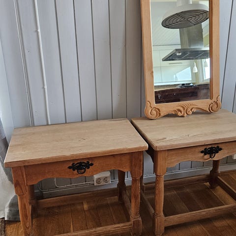 Er ikke IKEA.sidebord sett i tre. Settet består av to bord i ulik størrelse som kan skyves inn under hverandre for plassbesparende oppbevaring. Bordplatene er i tre med synlig åremønster, og understell er hvitmalt med buede ben. Egnet som sidebord ved sofa, som små avlastningsbord eller nattbord i ulike rom i hjemmet. S.60/60. L47/47