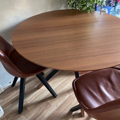 4 stoler i skinn og stål armlener i sort. Selges samlet til kr 1500,-