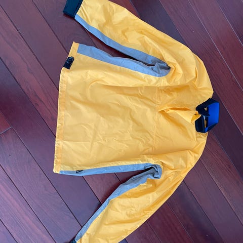 Prijon kajakkjakke i rød med grå felt. Jakken har neopren i hals, midje og mansjetter for tettere avslutning mot vann. Glidelåslomme på brystet og justerbar lukking nederst. Egnet som padlejakke til kajakk og annen vannsport.