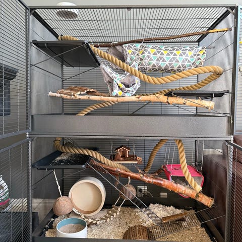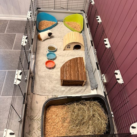 Dere kan gjerne få med utstyret vi har til ham, inkludert bur, gjerdet som vises på bildet, og litt annet tilbehør.