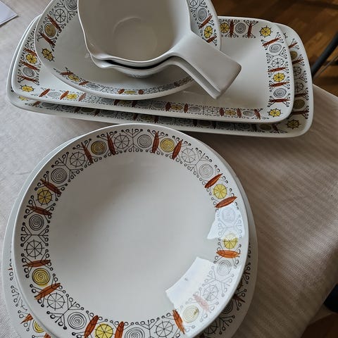 Rörstrand Clair De Lune håndmalt servise i hvitt porselen. Består av tallerkener, skåler, kopper med hank, skål med lokk og en liten mugge/fløtemugge. Tallerkenene har avrundet kant, og koppene har rett, enkel form. Serviset har en nøytral hvit glasur som passer til hverdagsbruk og enklere selskap. Enkel dekor med svakt buet linje langs kanten på noen av delene. Egnet til servering av varme og kalde retter, drikke, frokost og dessert.