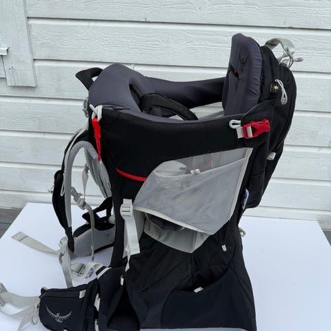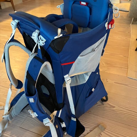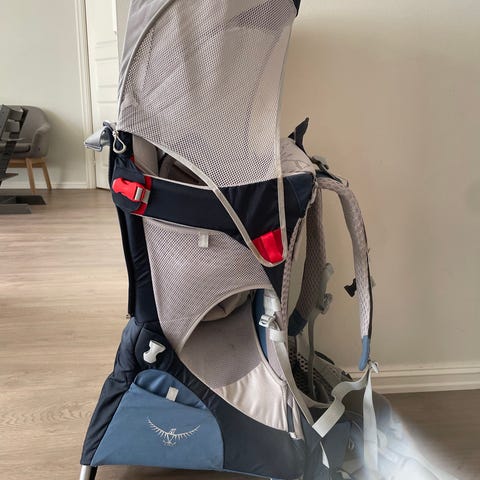 Selger en knall god bæremeis fra Osprey. Den har flere rom til div annet man trenger å ha med på tur. Den har solskjerming, regntrekk og et smart lite speil i liten lomme på beltet, slik at du kan følge med på den lille❣️ Bøyle kan vippes ut, slik at den kan stå på bakken.